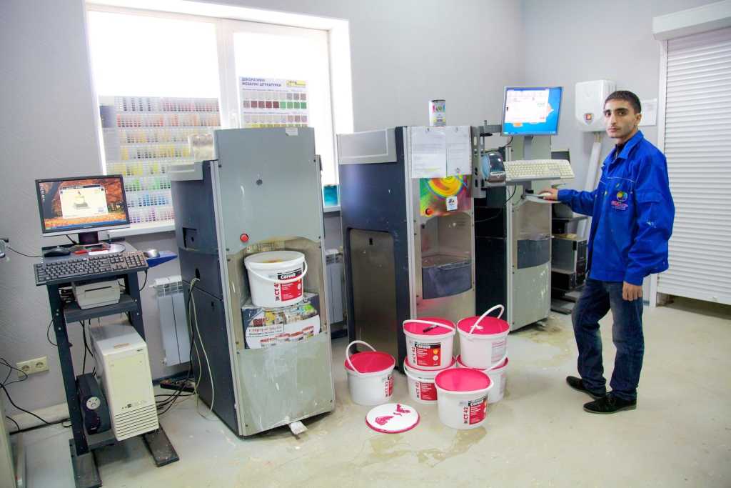 Большие строительные супермаркеты имеют отделы, где производится колерование при помощи профессионального оборудования. В специальный автомат размещается емкость с основой (обычно она белая). Задается программа с введением сведения о том, какой выбирается оттенок. Дозатор наливает в ведро соответствующий пигмент или комбинацию из нескольких красителей.