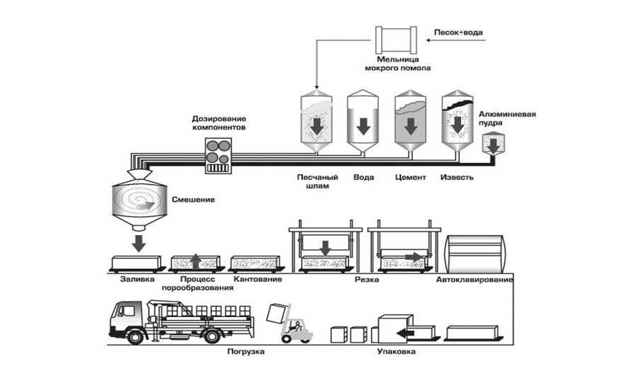 Весь план изготовления изделий состоит из нескольких этапов. Прежде всего, сырье необходимо тщательно просеять, дабы очистить материалы от примесей. После этого следует смешать песок с водой. Затем необходимое количество компонентов загружают в оборудование, за счет применения которого при смешивании происходят нужные реакции: получается раствор с ячеистой структурой. Готовую смесь формируют, согласно плану.
