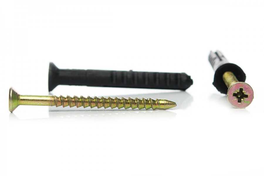 Также современная промышленность выпускает дюбель-крепеж с нанесенной на гвоздь резьбой и шлицем, который находится на головке изделия. Такой элемент можно монтировать при помощи отвертки. Работать с ним достаточно просто, так как процесс захода в дюбель гвоздя облегчается за счет наличия в изделии «сглаженной» резьбы. Добавим, что вершина резьбы данного монтажного приспособления направлена к головке. Чисто внешне дюбель-резьба ничем не отличается от стандартной упорной резьбы.