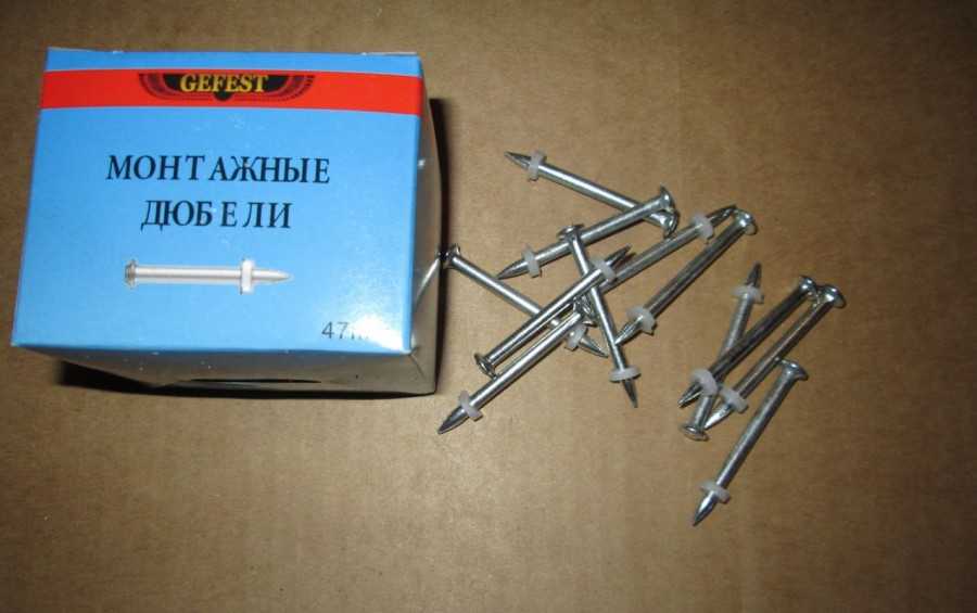 Существует еще стальной дюбель, но применяют его очень редко, только для устройства гипсокартонной обшивки. Дюбель-гвоздь обеспечивает оперативный, сквозной монтаж, легко забивается молотком в просверленное при помощи дрели отверстие.