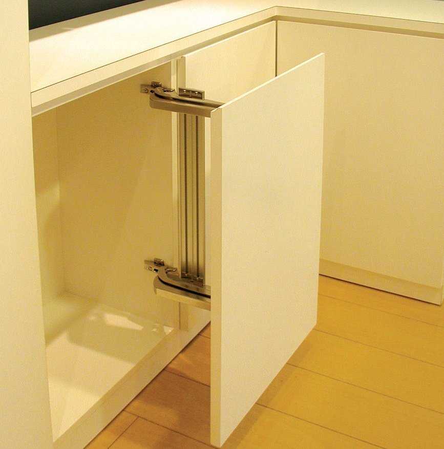 Конструктивно, по форме составляющих и способе открывания дверцы, механизмы бокового открывания очень напоминают описанные выше откидные, поворотные и вертикальные подъемники. Просто установлены они не на горизонт шкафа, а на боковую вертикаль.