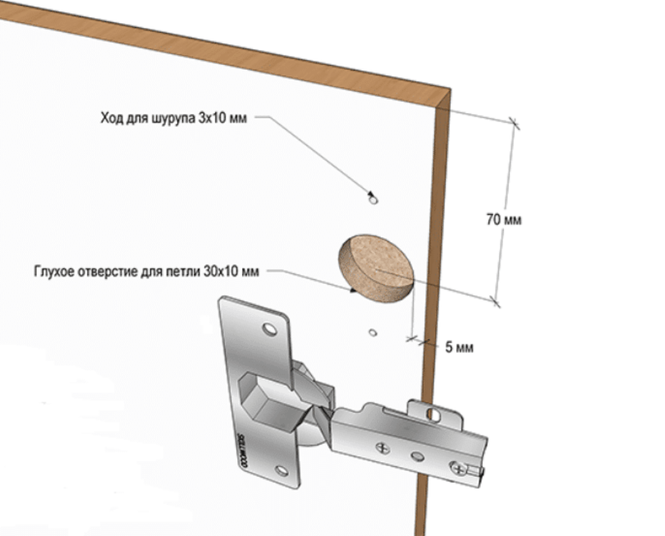 В закрытом состоянии двери петля плотно накладывается на торец боковой стенки шкафа. В основном их массово применяют в прямоугольных конструкциях кухонной мебели. Петля состоит из чашки с плечом и ответной планки. Как соединяются обе части, видно на рисунке.