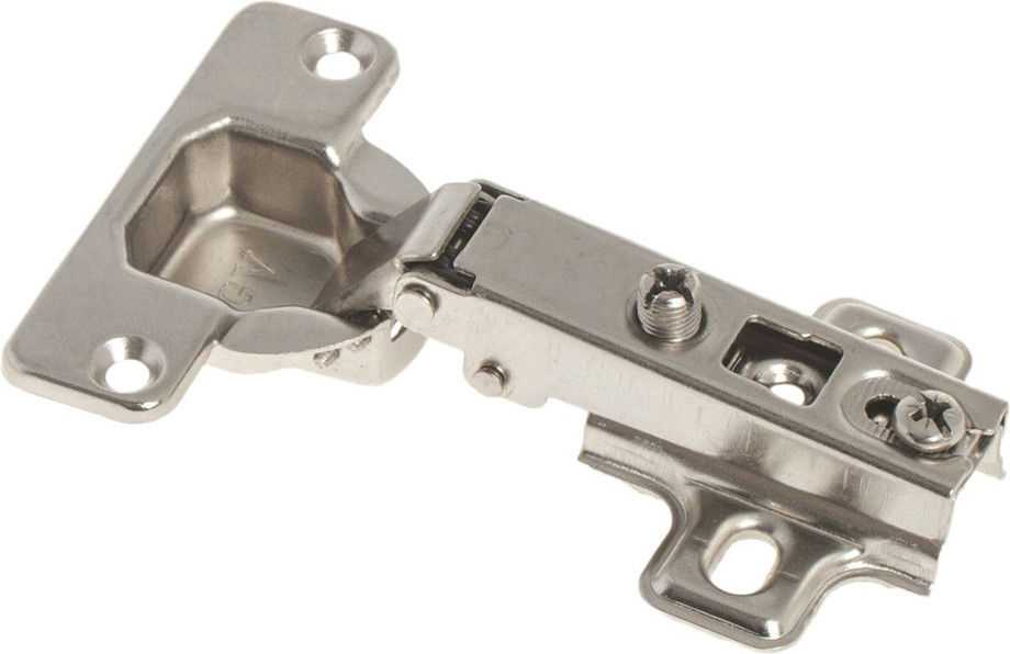 Эта разновидность имеет такое название благодаря способу его установки, а именно накладным типом. Петля состоит чашки, находящейся на планке, которая будет монтироваться к внутренней стенке, крепежной петли, шарнира. Ее установка не требует сверление фасадной поверхности. Это преимущество отличает накладную петлю от других разновидностей, выручает, когда невозможно врезаться в фасад из-за его толщины. Недостаток – имеют тугое крепление. Это не позволяет совершать регулировку в трех положениях.
