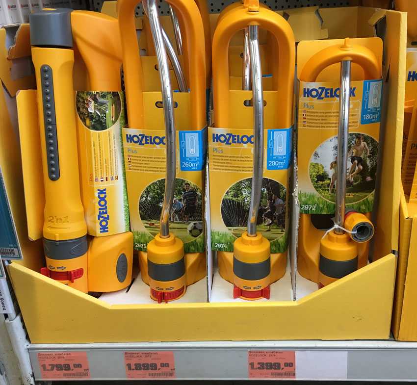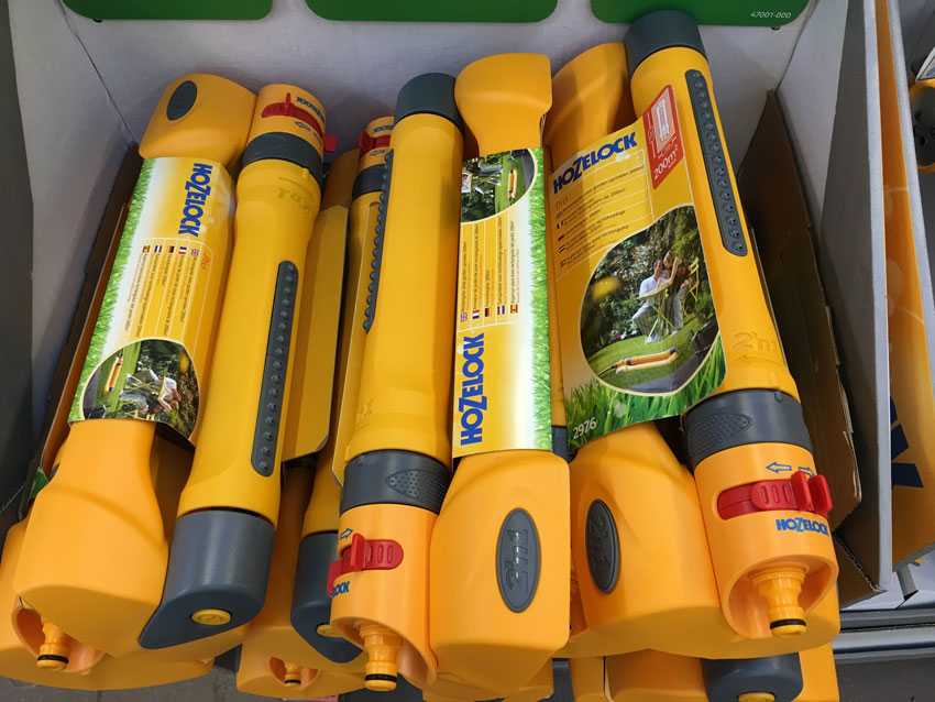 Многие люди и мы не исключение, придерживаются правила не покупать самый дешевый товар. Равно, как и самый дорогой. Нас приучили искать золотую середину, вот мы и нашли. Сначала решили купить дождеватель фирмы Hozeloсk. Он не только был примерно в середине ценового диапазона — 1800 руб., но и имел красивый желтый цвет. Одно слово — золотая середина.