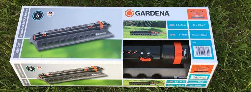 Этот бренд предоставляет широкий выбор осциллирующих поливалок. Такой вариант оптимально подходит для полива прямоугольной территории. Модель Gardena 2079-32 оснащена регулятором расхода воды, что позволяет вам выбрать самостоятельно, какое количество воды уйдёт на полив. Максимальная ширина полива составляет 13 метров, а длина – 17 метров. Чтобы начать пользоваться прибором, достаточно подключить подачу воды и открыть запорный регулятор.