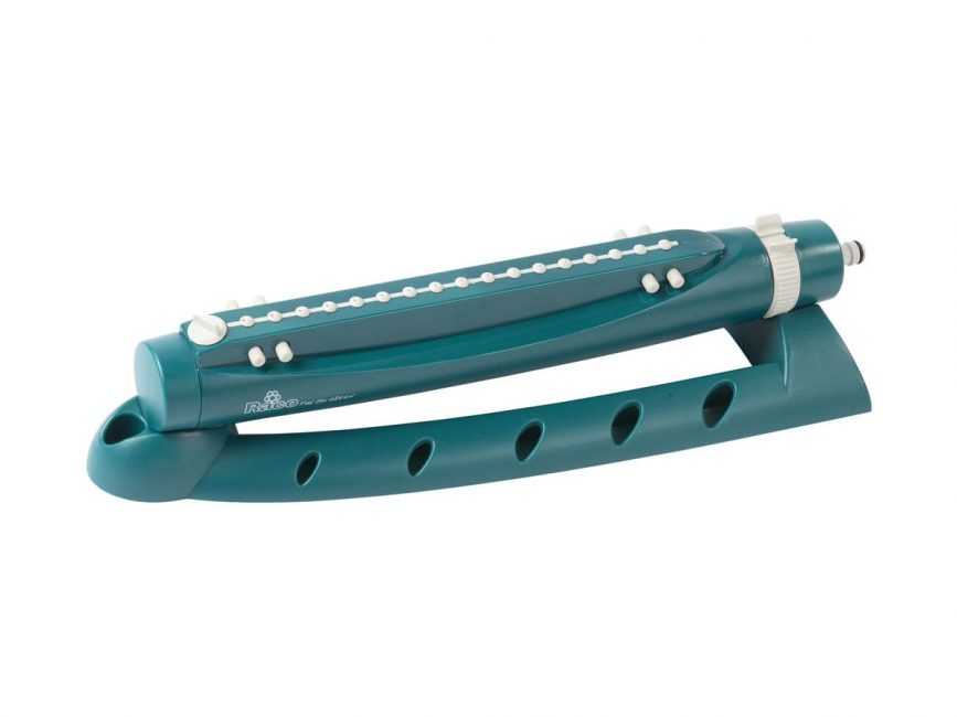Дождеватель для полива растений – устройство, которое помогает справиться с уходом за растениями в жаркое время года. Модель RACO 4260-55/691 – хороший вариант разбрызгивателя осцилирующего типа. Прибор рассчитан на прямоугольный участок, так как имеет 18 сопел. Установка происходит на подставку, идущую в комплекте.