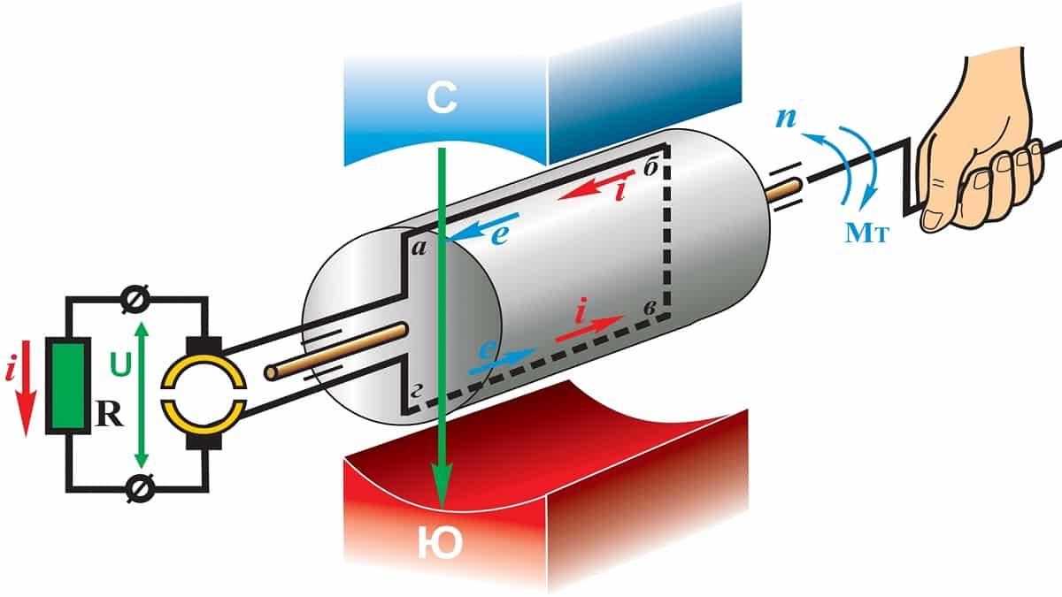 Функционирование генератора основывается на свойствах, которые следуют из известного закона электромагнитной индукции. Когда замкнутый контур разместить между полюсами магнита (постоянного), то в условиях вращения он будет проходить через магнитный поток. Во время перехода вырабатывается электродвижущая сила, возрастающая при приближении к полюсу. В случае, если присоединить нагрузку, то образуется поток тока. Когда витки рамки будут выходить из области воздействия магнита, то ЭДС будет уменьшаться и достигнет нуля при горизонтальном положении рамки. При дальнейшем вращении противолежащие контурные части изменят магнитную полярность.