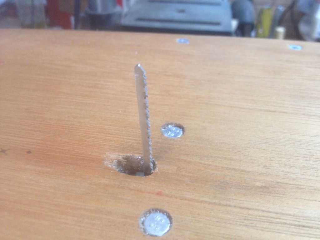 Отмеряем и просверливаем 2 отверстия для винтов подшипников. Их расположение должно быть равноудаленным друг от друга, на расстоянии, равном толщине пилки электролобзика.