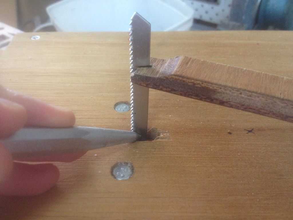 Откручивают верхнюю панель, которая служит защитой механизмов. Прорезь для иголки расширяют до параметров пилки