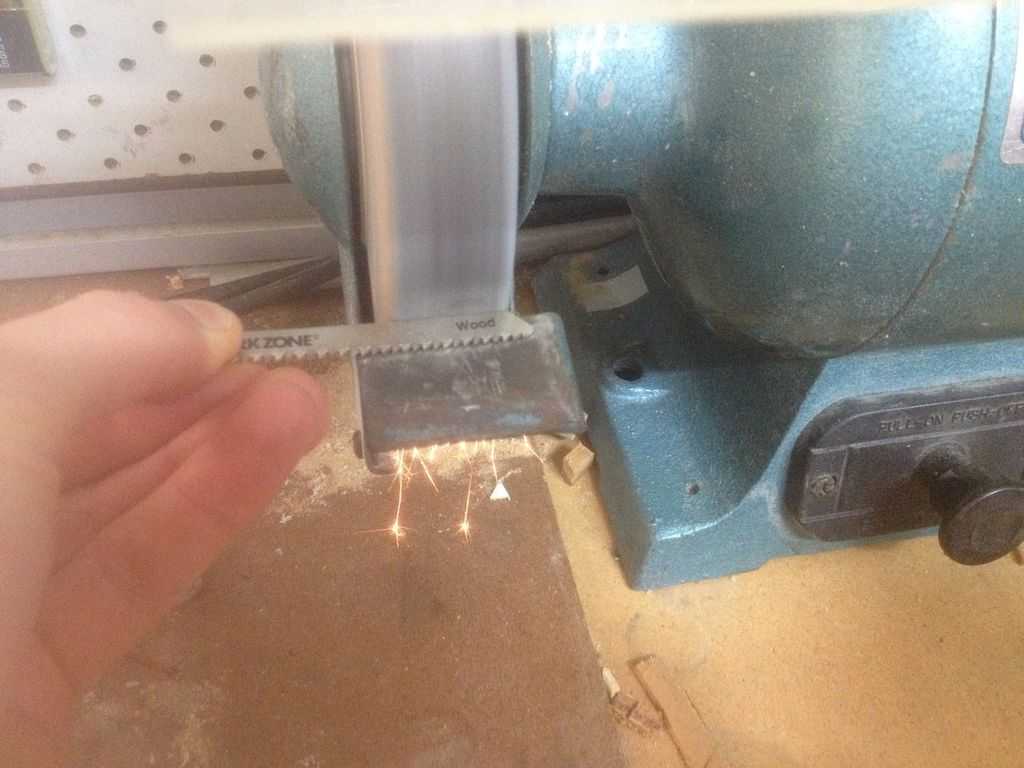 - Снимите пилку с лобзика и на шлифовальном станке сточите полотно до нужной ширины. Во время шлифования обмакивайте пилку в прохладную воду, чтобы она не перегревалась, иначе металл потеряет твердость, и пилка уже ничего не сможет прорезать. Изменение цвета – признак перегрева металла.