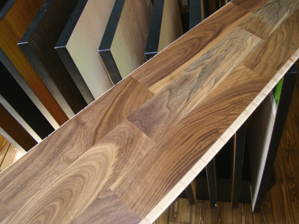 - Лицевой слой покрытия делается из дорогих пород древесины. Обычно это тонкая ламель толщиной 1-4 мм. На заводе эта часть доски подвергается разным видам обработки: тонировке колеровочными лаками, пропитке маслами, брашированию. Для защиты тонкой ламели, продления срока службы изделия и увеличения его износостойкости в заводских условиях выполняется многослойное лаковое покрытие.