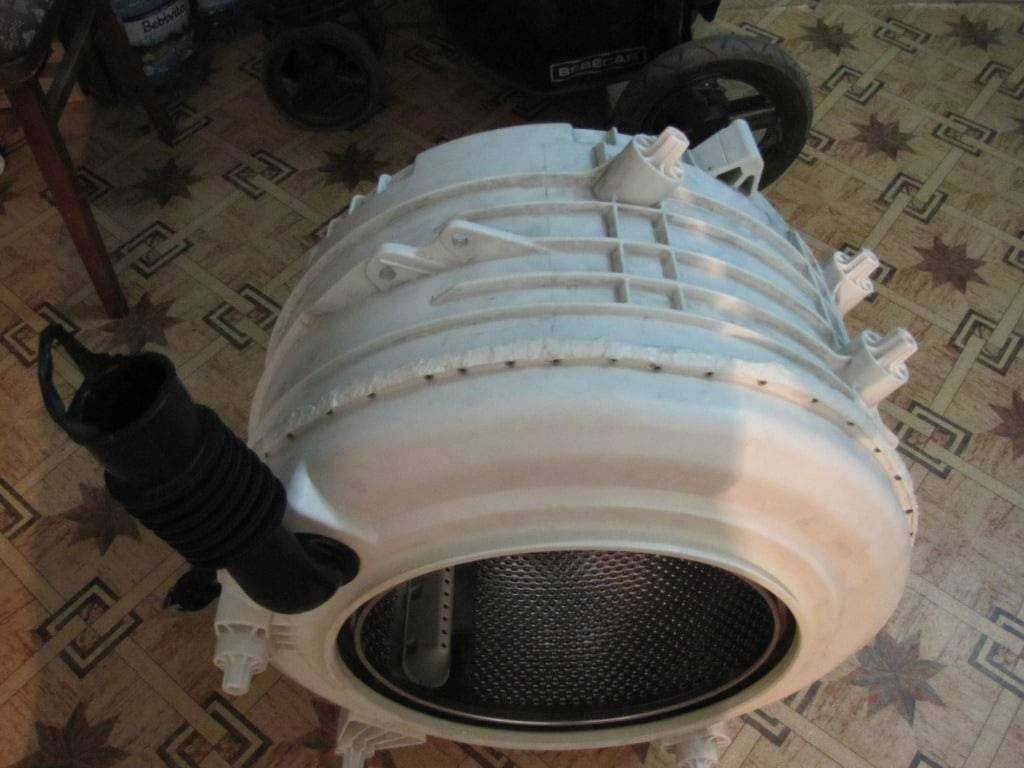 Перед тем, как выбить подшипник из барабана, необходимо разобрать бак. Состоит он из двух частей. В зависимости от модели СМА половинки могут скрепляться болтами и защелками, а могут быть склеены. В последнем случае задача усложняется.