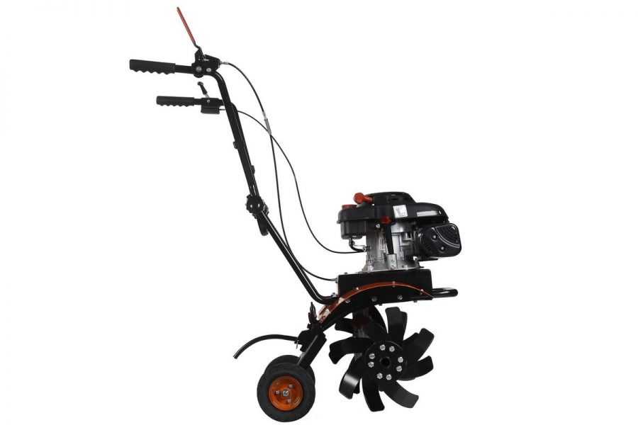Рукоятка мотокультиватора обладает способностью складываться, а также менять положение по высоте и наклону. Чтобы было удобно перевозить машину, имеется транспортировочное колесо, установленное на крепкой опоре. Во время вспашки особое устройство перемещает это колесо вверх.