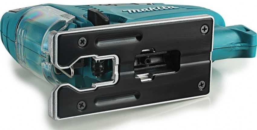 Электромотор снабжен системой торможения. В отличии от предыдущей модели, лобзик не оборудован подсветкой рабочей зоны, зато производитель снабдил инструмент защитным экраном, сдувом опилок и возможностью подключения пылесоса. Универсальный штыковой хвостовик позволяет устанавливать на электролобзик “Макита” пилки от разных изготовителей. Число оборотов регулируется электроникой, имеется 4 положения маятникового хода.