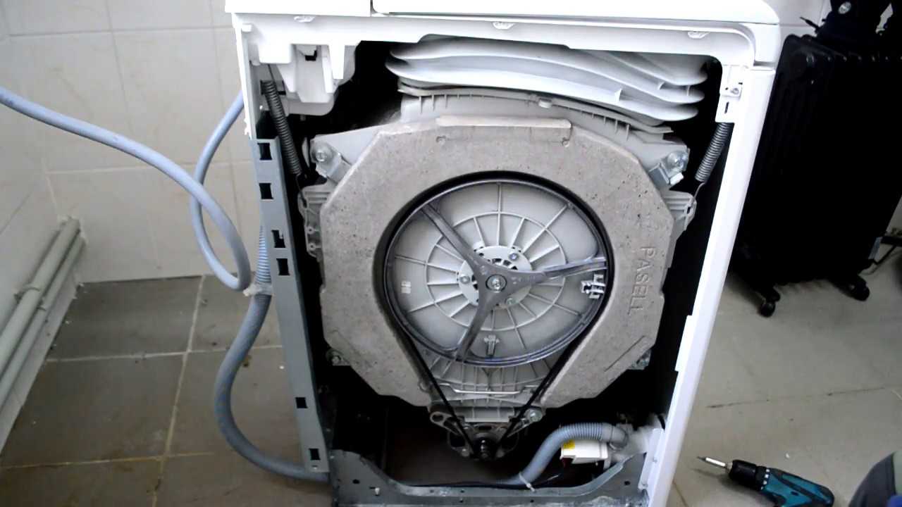 Следующим этапом по замене сальника и подшипников является демонтаж барабана. Для этого нужно достать и вытянуть бак, потянув его вперед. Все модели Іndesit оснащены баком цельной конструкции. Для того чтобы иметь возможность получить доступ до барабана, придется разделить бак на 2 части. Сделать это можно, распилив его при помощи болгарки или пилы для работы по металлу.