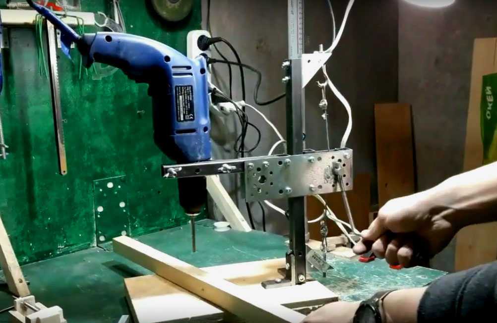 ФОТО: YouTube.comКрепите дрель к плечу стойки скобой и включаете её в сеть, фиксируя кнопку. Потом просто управляете механизмом подъёма, подкладывая нужные детали ФОТО: YouTube.comДрель с лифтовым механизмом легко справляется с деревом, но гораздо медленнее – с металлом. А вот рычаг с пружиной без проблем освоит любые материалы