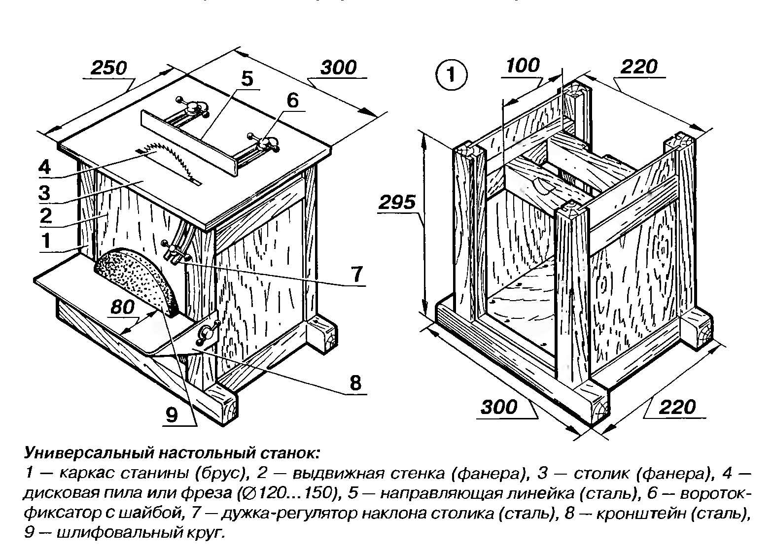 Стационарная циркулярная пила предназначена для выполнения достаточно больших объемов работ. Конструкция реализуемого варианта в двух видах представлена на схеме далее. На ней указаны также основные размеры установки, от которых рекомендуется отталкиваться при самостоятельной сборке.