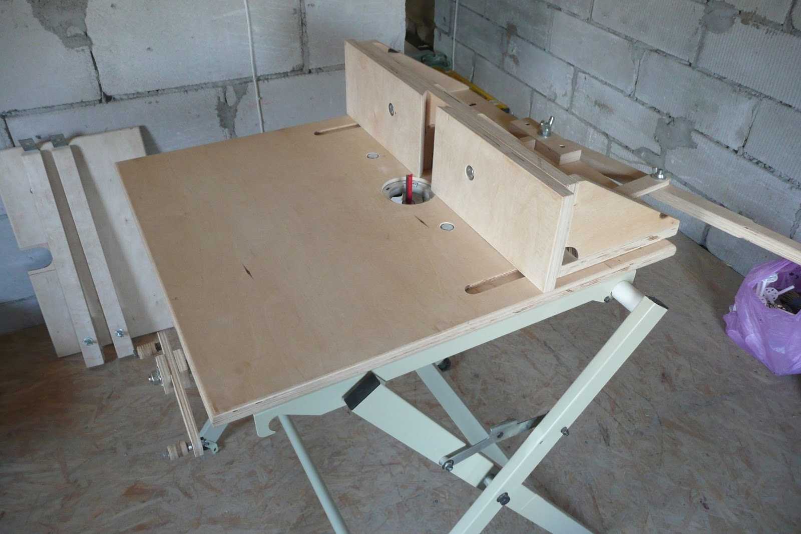 Для изготовления столешницы применяется фанерный лист. Его длина может быть какой угодно. Ширину можно сделать 35 см, что будет удобным для подавляющего большинства циркулярок. Отступив 10 см от длинного края фанеры нужно нанести разметку для установки профиля с Т-образным пазом. Желательно, чтобы профиль был короче фактической длины столешницы, что позволит в дальнейшем облегчить хранение станка. Профиль нужно посадить в паз. Удобнее всего его выбирать ручным фрезером установив параллельный упор. При работе с фанерой лучше углубляться постепенно, сделав выборку в несколько проходов.