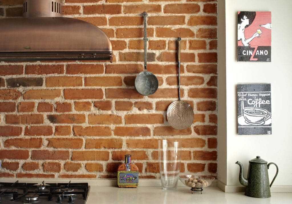 В кухонном пространстве декоративная кладка применяется как интересная альтернатива кафельной плитке. Разновидности имитации кирпича с влаго/жиро/теплоустойчивыми свойствами используют при оформлении фартука над рабочей зоной, или же создают акценты на стене возле обеденного стола. Выбирают гладкие модели со стойкой к моющим средствам поверхностью.