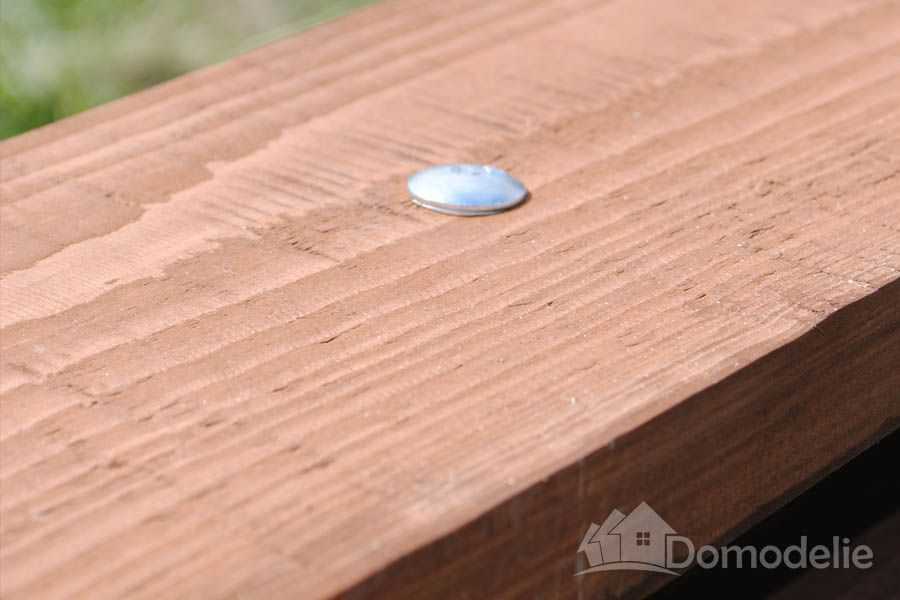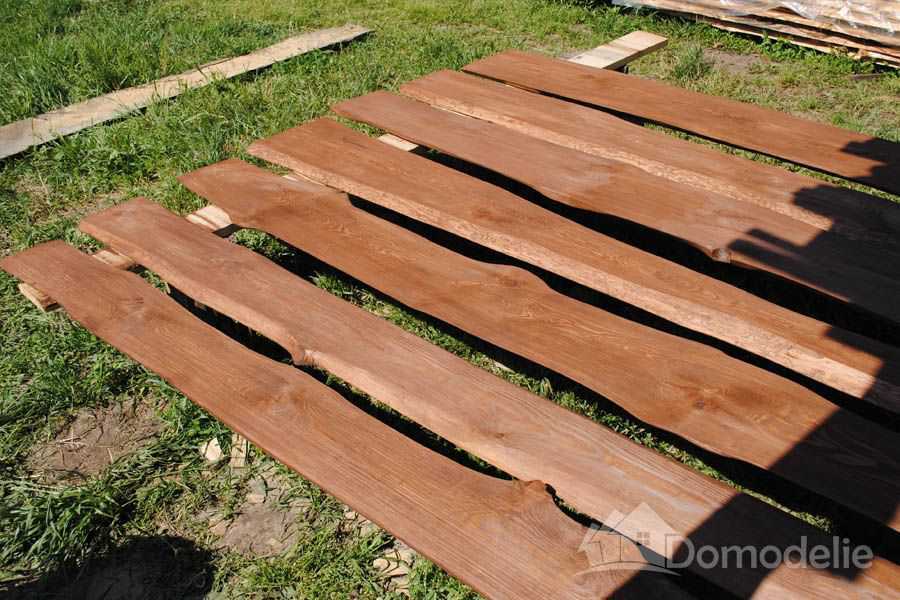 Следующий этап обработки древесины – покраска. В нашем случае были выбраны два состава: бесцветный, трудновымываемый антисептик для эксплуатации древесины в тяжелых условиях и декоративная пропитка для наружных работ. Первой пропиткой, обеспечивающей длительную защиту от плесени и жуков, доски покрывались кистью в два слоя, торцы вымачивались в емкости. Интенсивность и насыщенность цвета второй позволила покрывать этим составом в один слой.
