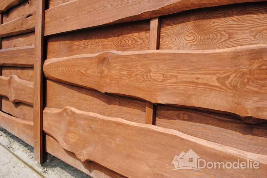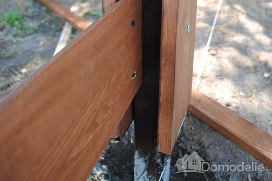 В образовавшийся паз горизонтально входили подготовленные необрезные доски. Посередине секции устанавливалась обработанная по той же технологии планка. Доски в трех местах крепились черными саморезами по дереву.