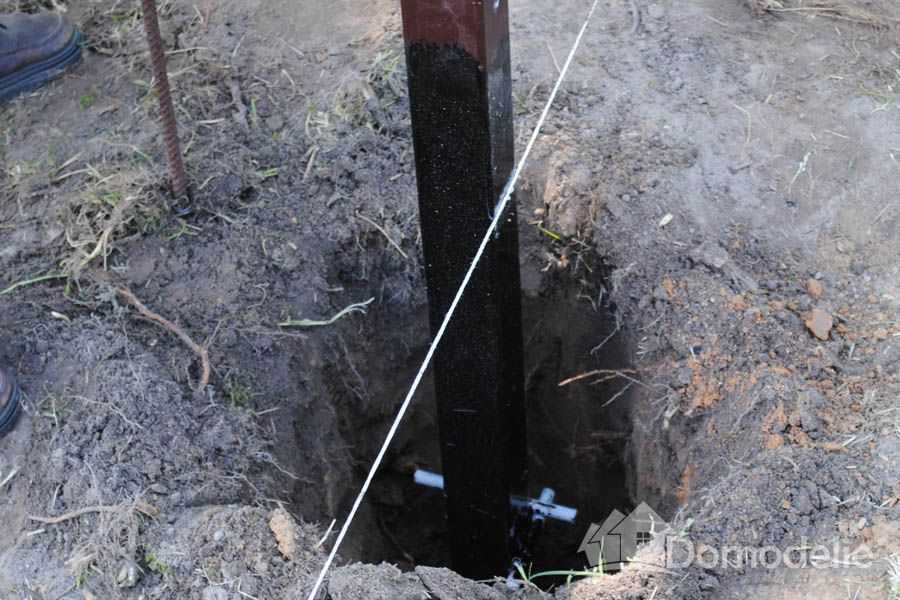 Для этого металлические трубы были порезаны в размер, к каждой приварены небольшие поперечины из отрезков арматуры для большей устойчивости основания при бетонировании, металл обрабатывался составом от ржавчины и красился эмалью в целом и дополнительно битумной мастикой в «подземной части». Затем заготовки были выставлены по уровню и забетонированы.