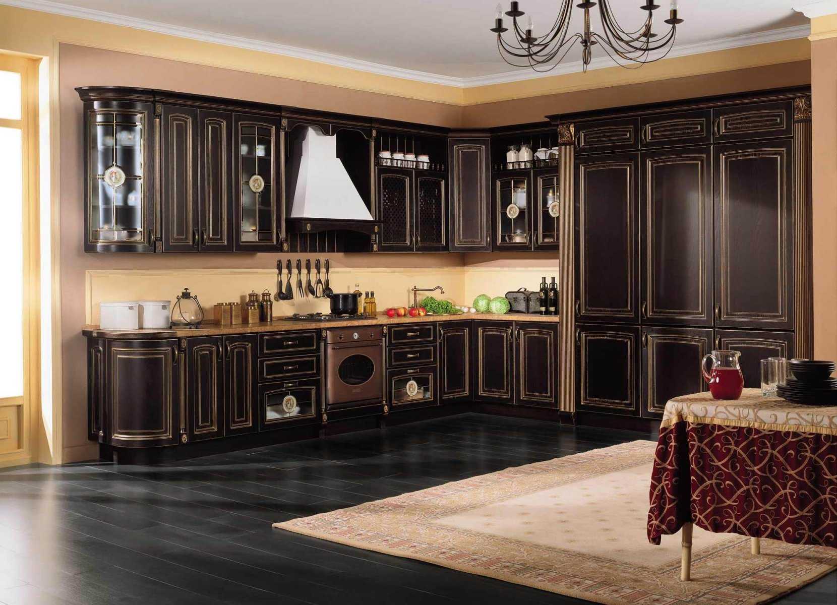 - Благородный темный цвет (темный дуб, венге, ореховый, шоколад). Для того чтобы добиться таких оттенков, материал подвергают температурной обработке, которая дополнительно укрепляет древесину. Также подобные красивые тона можно получить через процесс морения. У некоторых пород ценного дерева природный темный цвет, сюда относится дуб Коньяк. С такой мебелью хорошо будут смотреться глубокий синий, золотой, красный, бордовый, темно-зеленый оттенки. Под мебель венге подойдут светлые варианты обоев, пола или дверей.