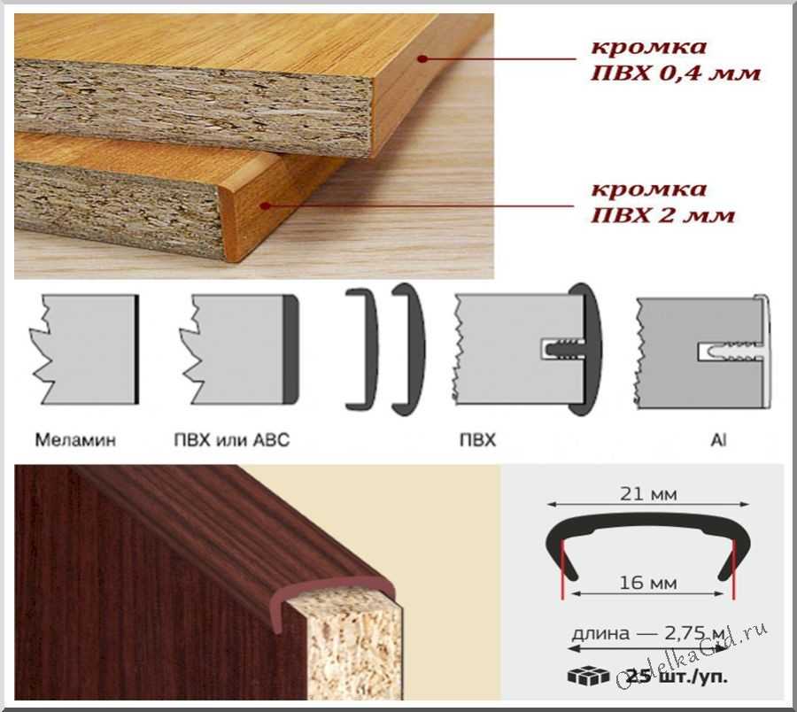 Меламиновая и тонкая (до 1 мм) ПВХ или АВС лента считается ненадежным вариантом, она используется только для обработки внутренних поверхностей, внешний край обрабатывается кромкой от 2 мм, при этом самую высокую защиту дают ПВХ и алюминиевые молдинги под фрезерованный паз