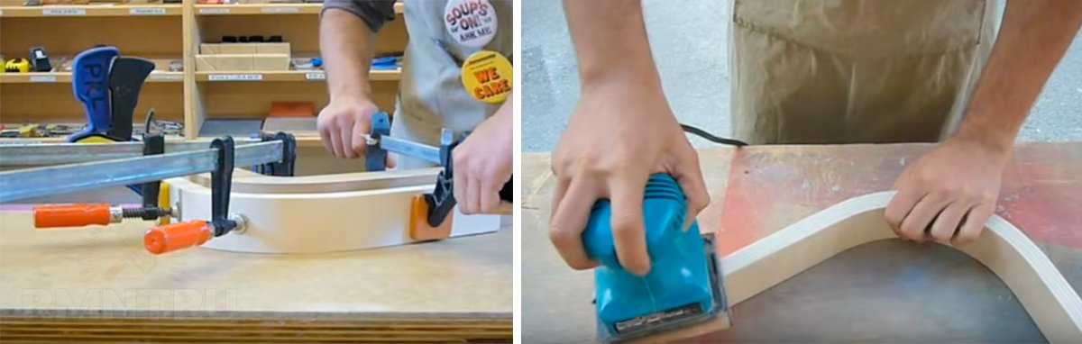 Еще один способ получения деталей из толстой фанеры – склеивание. При этом методе заготовку изогнутой формы вырезают с припуском в 2-6 мм из тонкого материала – это выкройка. Ее накладывают на лист так, чтобы в готовом изделии чередовались направления шпона для получения нужной жесткости и пластичности. Слои фанеры надо склеить между собой эпоксидным составом и зажать заготовку струбцинами на 24 часа – это придаст нужную форму. Когда деталь полностью высохнет, ее надо отшлифовать и сточить неровности по краям.