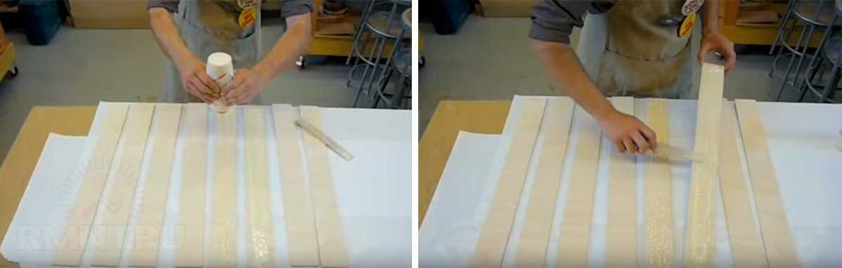 Далее нужно зафиксировать заготовку с помощью шаблона и наклеить сверху дополнительный лист шпона. Заготовку оставляют для просушивания примерно на сутки. Склеить заготовку можно как пропилами внутрь, так и наружу.