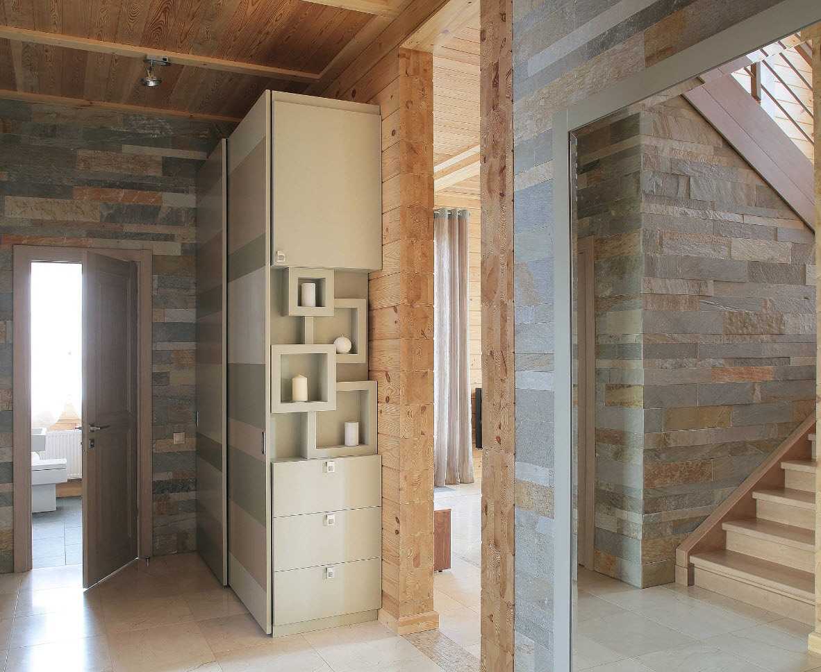 Фальш-брус хорошо подходит для внутренней отделки помещений, выдержанных в эко-стиле. Он придаёт интерьеру свежий вид, обладает хорошими тепло- и звукоизоляционными свойствами.