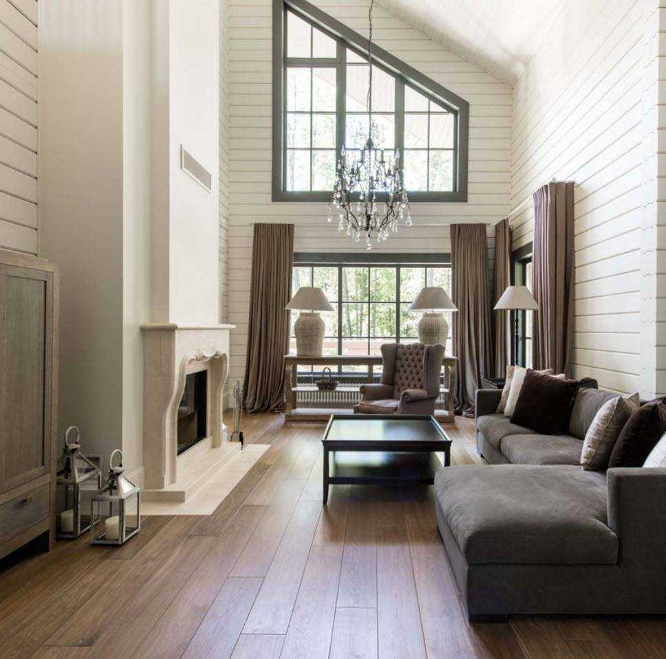 Элементы дворцовой торжественности присущи классическим решением загородного коттеджа. Дом выдерживают в едином стиле, чтобы поддержать нужную атмосферу. В отделке потолка могут использовать имитацию гипсовой лепнины, молдинги, стены украшают картинами или панно. Для пола выбирают отделку под паркет или застилают его дорогими коврами.