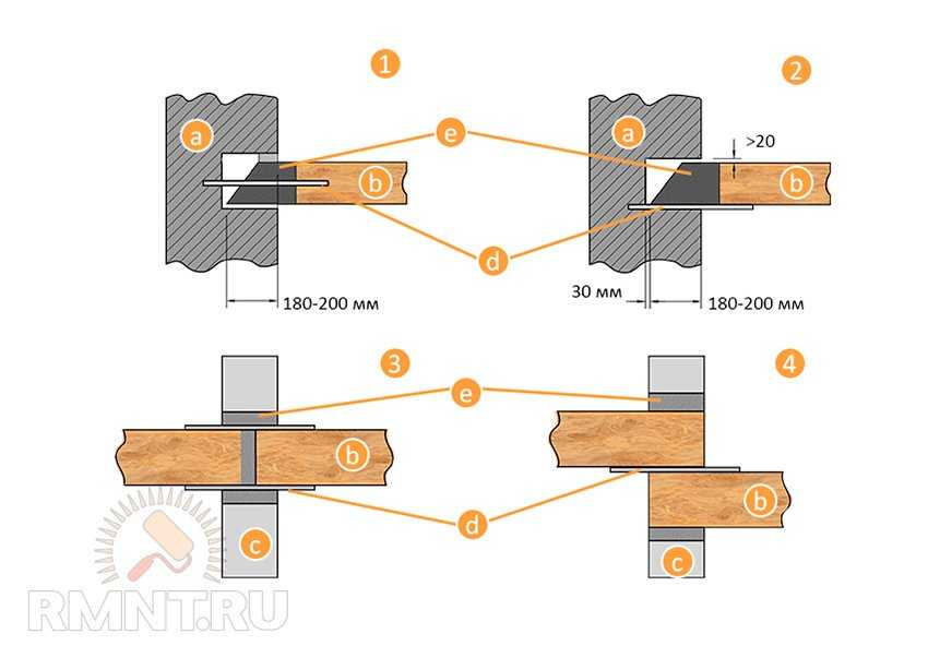 Балки перекрытия пропитываются антисептическими составами, а конец обязательно изолируется двумя слоями гидроизоляции (толь, пергамин). Место между стеной и боковой поверхностью балки заполняется раствором.