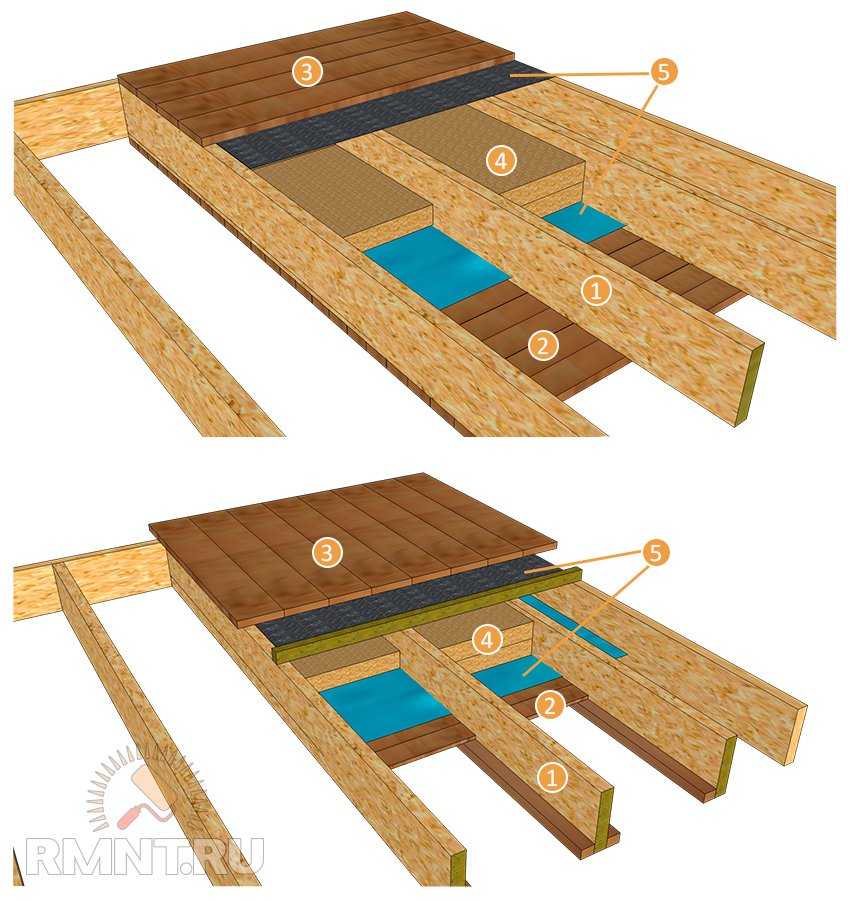 Балки и лаги подбиваются снизу щитами из тонкой доски, ГКЛ, ГВЛ, ОСП или другими листовыми материалами. Стелется мембранная изоляция, на которую укладывается тепло- и звукоизоляционный слой. Это может быть насыпной, плитный или рулонный утеплитель, закладываемый между балками.