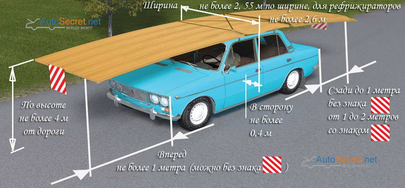 Заметьте, что у нас остался не удел один размер, когда вылет груза сзади более 1 метра, но до 2 метров. В этом случае груз с таким размером не требуется перевозить по правилам, но на него необходимо закрепить знак «Крупногабаритный груз».