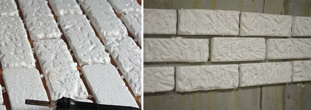 Плюсами данного способа являются легкость в резки и обработки пенопласта, небольшое количество пыли при проведении внутренних работ. Пенопласт дешевле штукатурки и хорошо крепится к рабочей поверхности. Однако у него есть и свои недостатки — он имеет небольшую ударопрочность, что позволяет ему легко откалываться и деформироваться при ударах. Чтобы избежать возможной деформации, можно взять плотный мелкозернистый пенопласт. Он не так подвержен изломам и не крошится при резке, что обеспечит прямые углы у каждого кирпичика.